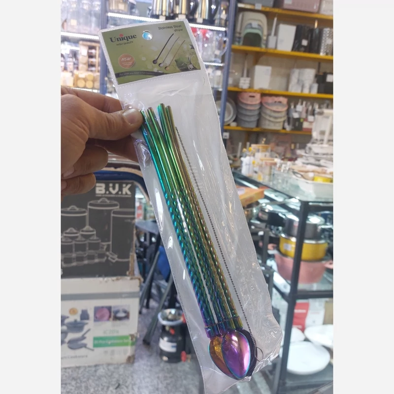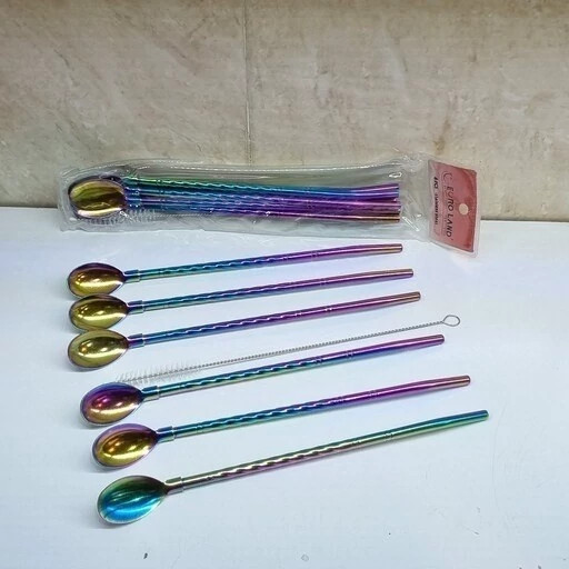 نی شربت خوری 7رنگ فرچه دار مدل 4577 موجب سهولت در نوشیدن شربت و بستنی شده به طوری که شما و میهمانان به راحتی می توانید بدون نیاز به قاشق و نی مجزا هر دو آنها را یکجا و با طراحی شیک و جذاب داشته باشید. این نی شربت ها دارای جنس استیل 18/10 آهنربا نگیر ضد زنگ در مدل مارپیچ طلایی با سایز 20 سانتی متر است که در بسته های 6 عددی بهمراه فرچه تمیز کننده روانه بازار شده است