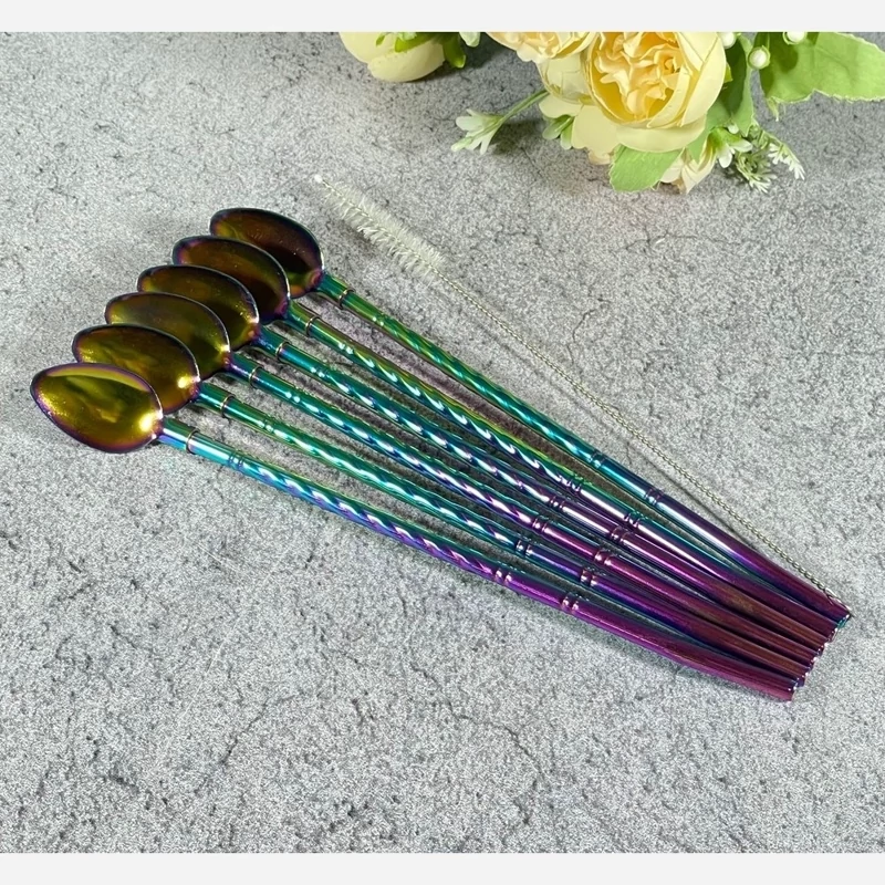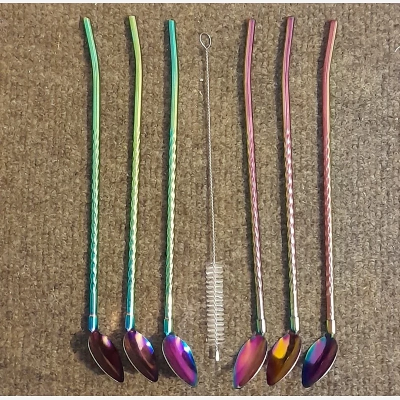 نی شربت خوری 7رنگ فرچه دار مدل 4577 موجب سهولت در نوشیدن شربت و بستنی شده به طوری که شما و میهمانان به راحتی می توانید بدون نیاز به قاشق و نی مجزا هر دو آنها را یکجا و با طراحی شیک و جذاب داشته باشید. این نی شربت ها دارای جنس استیل 18/10 آهنربا نگیر ضد زنگ در مدل مارپیچ طلایی با سایز 20 سانتی متر است که در بسته های 6 عددی بهمراه فرچه تمیز کننده روانه بازار شده است