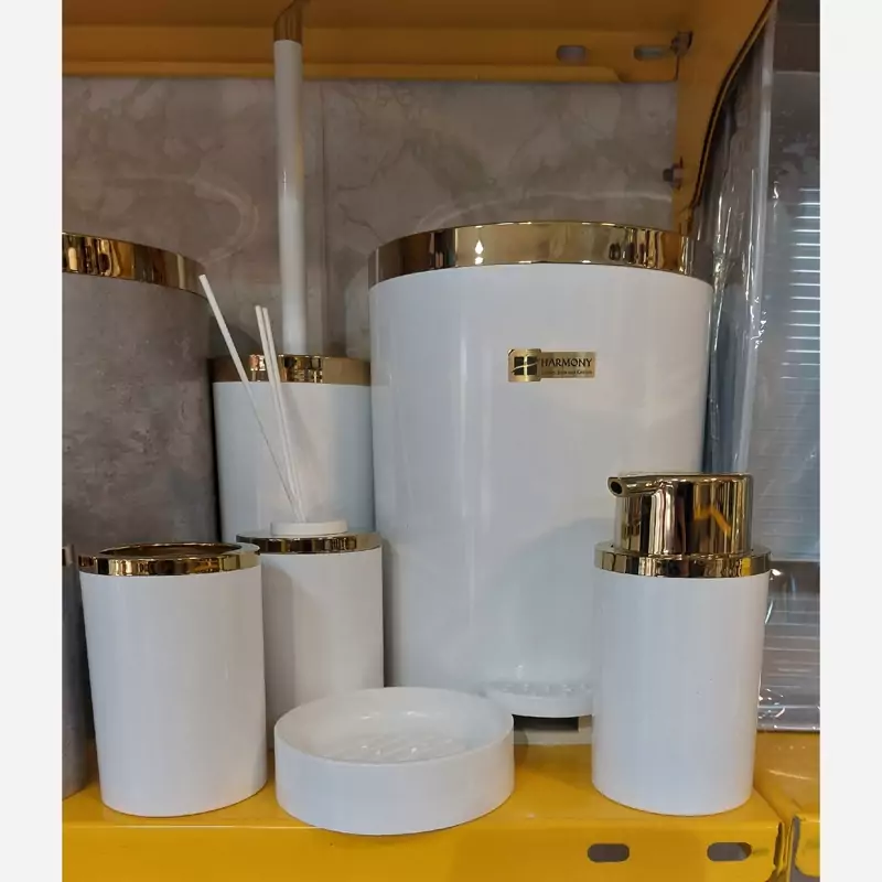 سرویس 6 پارچه روشا طوسی طلایی هارمونی، از جنس پلاستیک است. این محصول شامل سطل، فرچه، جا مایع، جا صابون، جا مسواک و جا خوشبو کننده می باشد. درب سطل این ست 2 حالته بوده و به صورت پدالی و بادبزنی باز می شود. ابعاد سطل : 25.5*19.5*20.5 ابعاد فرچه : 43.5*9.5*9.5 ابعاد جا صابونی : 3*11*11 ابعاد جا مسواک : 11.5*7.5*7.5 ابعاد جا مایع : 17*7.5*7.5 ابعاد جا خوشبو کننده : 11.5*7.5*7.5