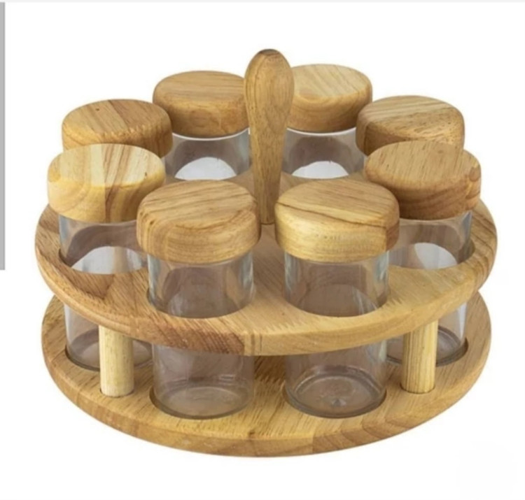 8 ظرف شیشه ای و درب چوبی به همراه یک استند گردان از جنس رابروود
